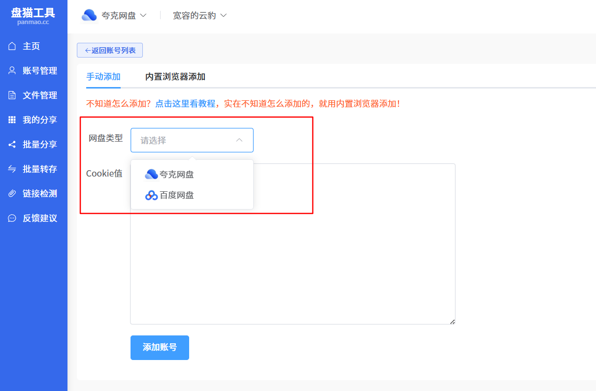 3、把复制的cookie信息粘贴到对应的输入框中,最后点击下面的添加账号按钮