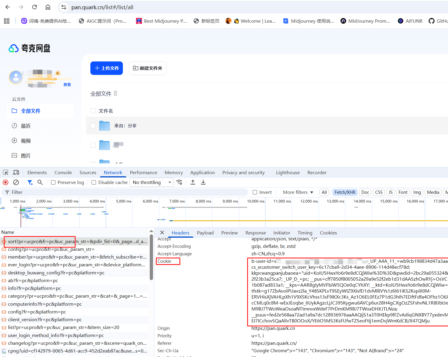 夸克网盘我这里选的是 列表接口 sort这个(要是没找到就随便点一个接口),点击后在右边选择”Headers“,然后在下面找到"Cookie",复制对应的内容。